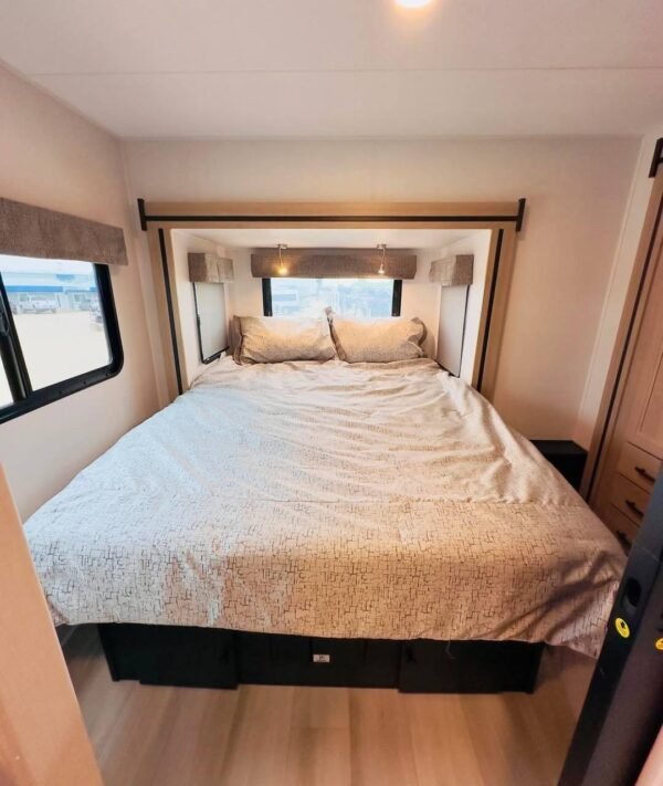– There is a queen-sized bed in the back, a dinette that converts into a bed, and bunk beds if needed.
